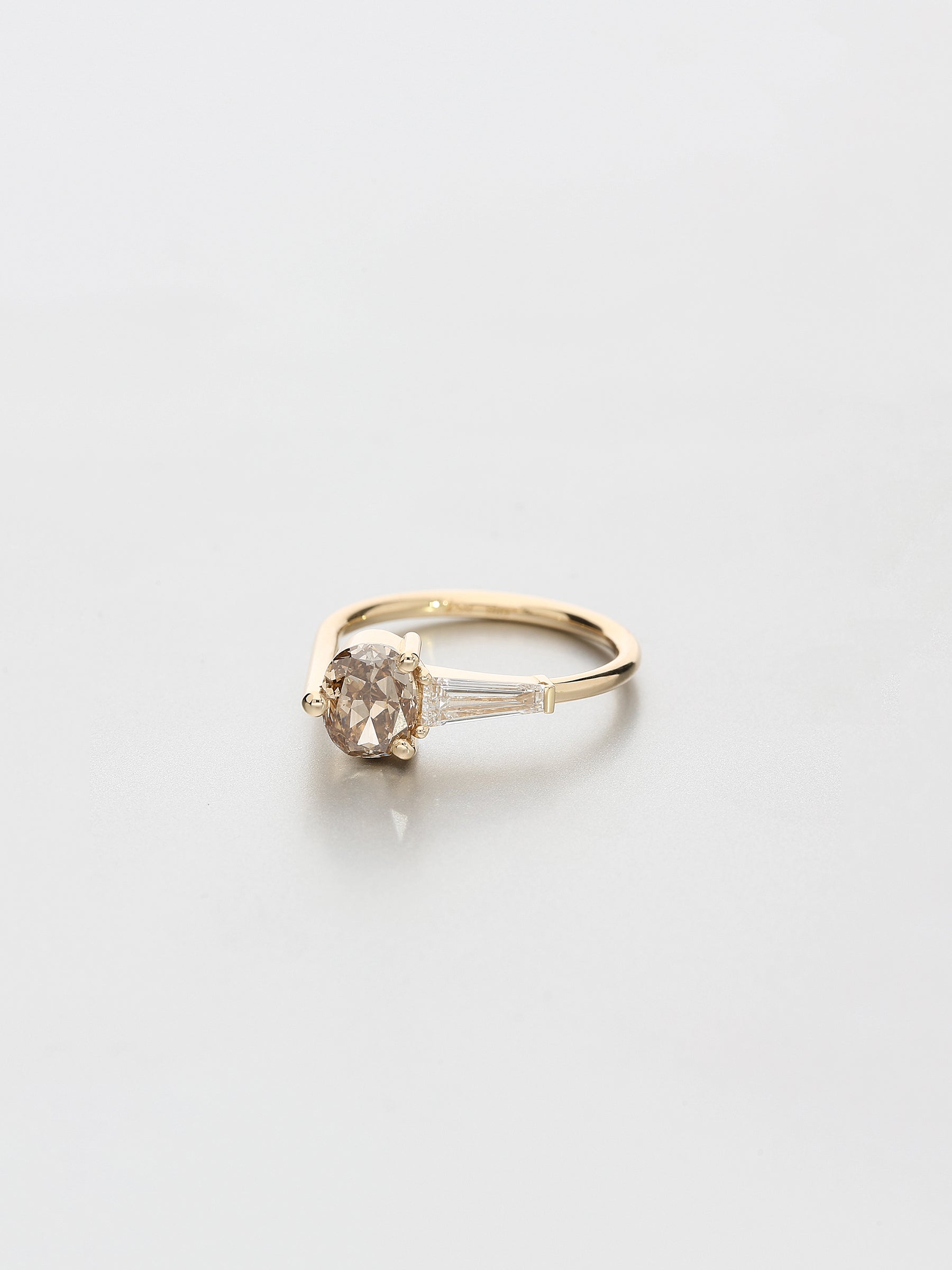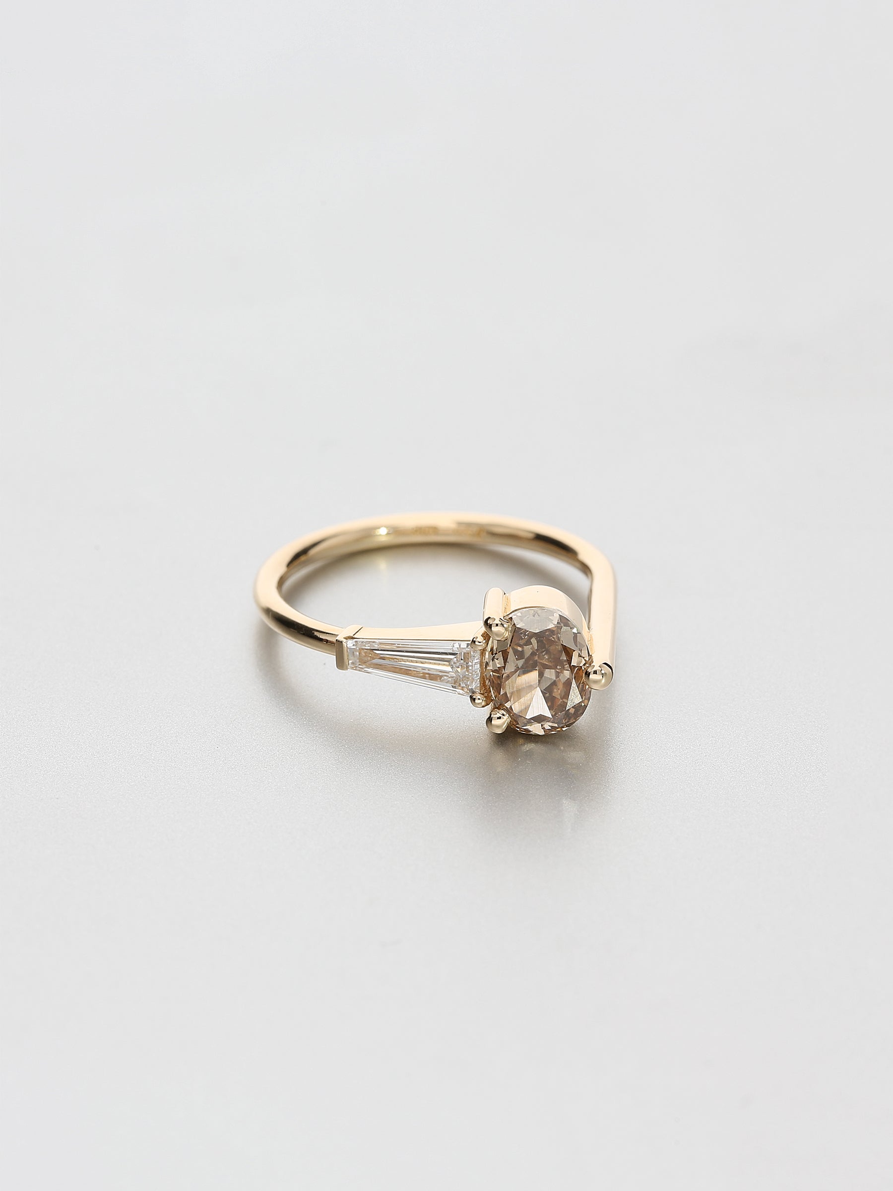 A striking duo of an oval Cognac diamond and a startling tapered baguette diamond creates an intriguing composition on the Ada IV ring.