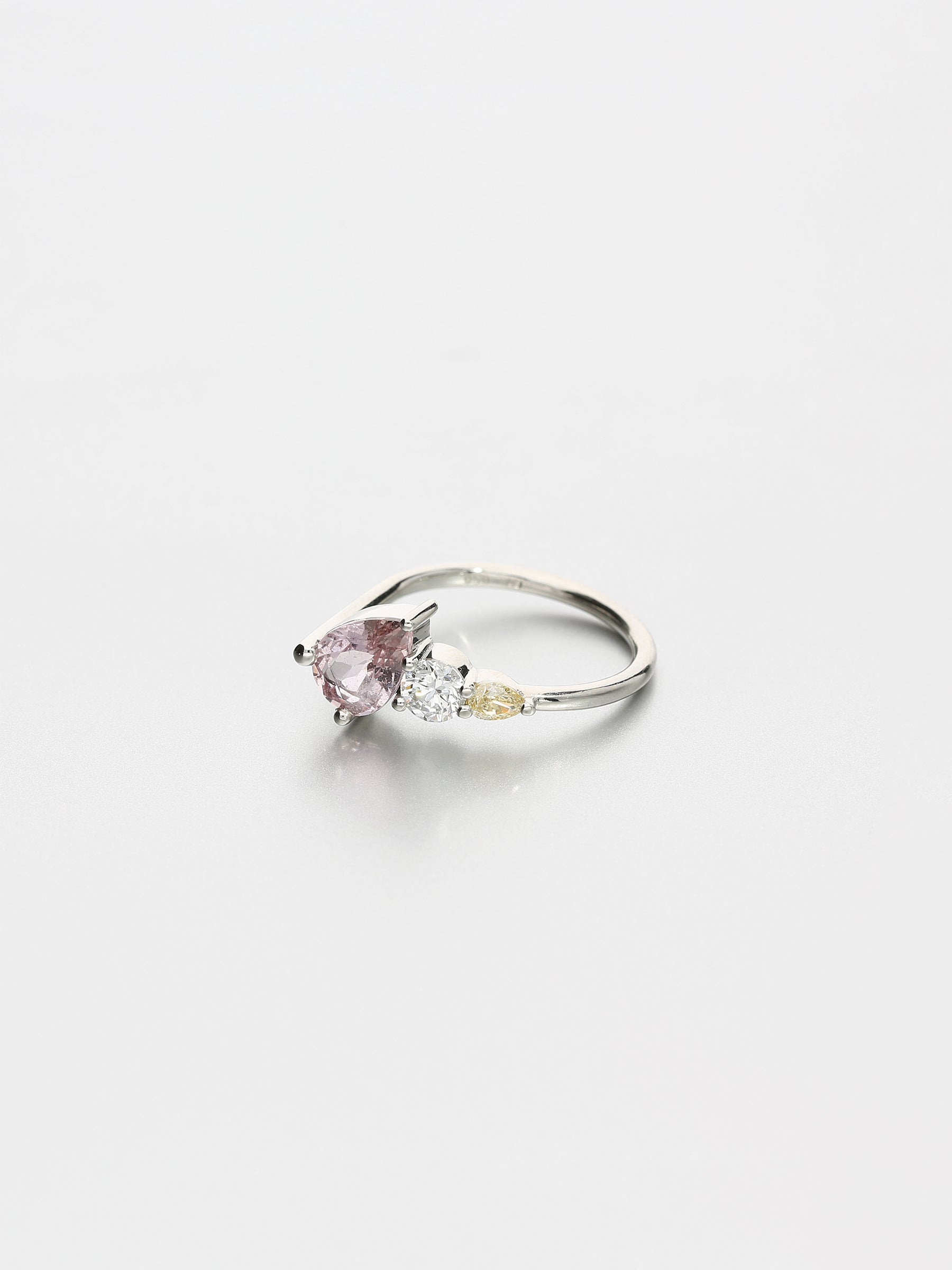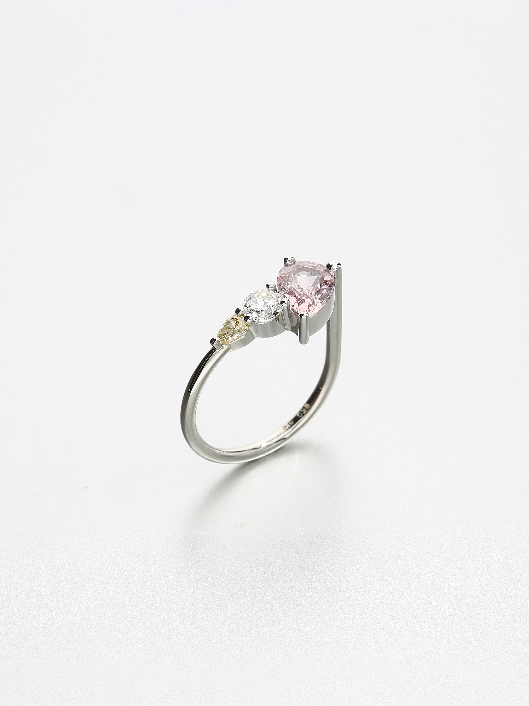 The Ada VIII sets askew a pink pear cut sapphire followed by a white brilliant cut diamond and finish with a yellow pear cut diamond. An unconventional trio worn alone or framed by a curved band made to order.