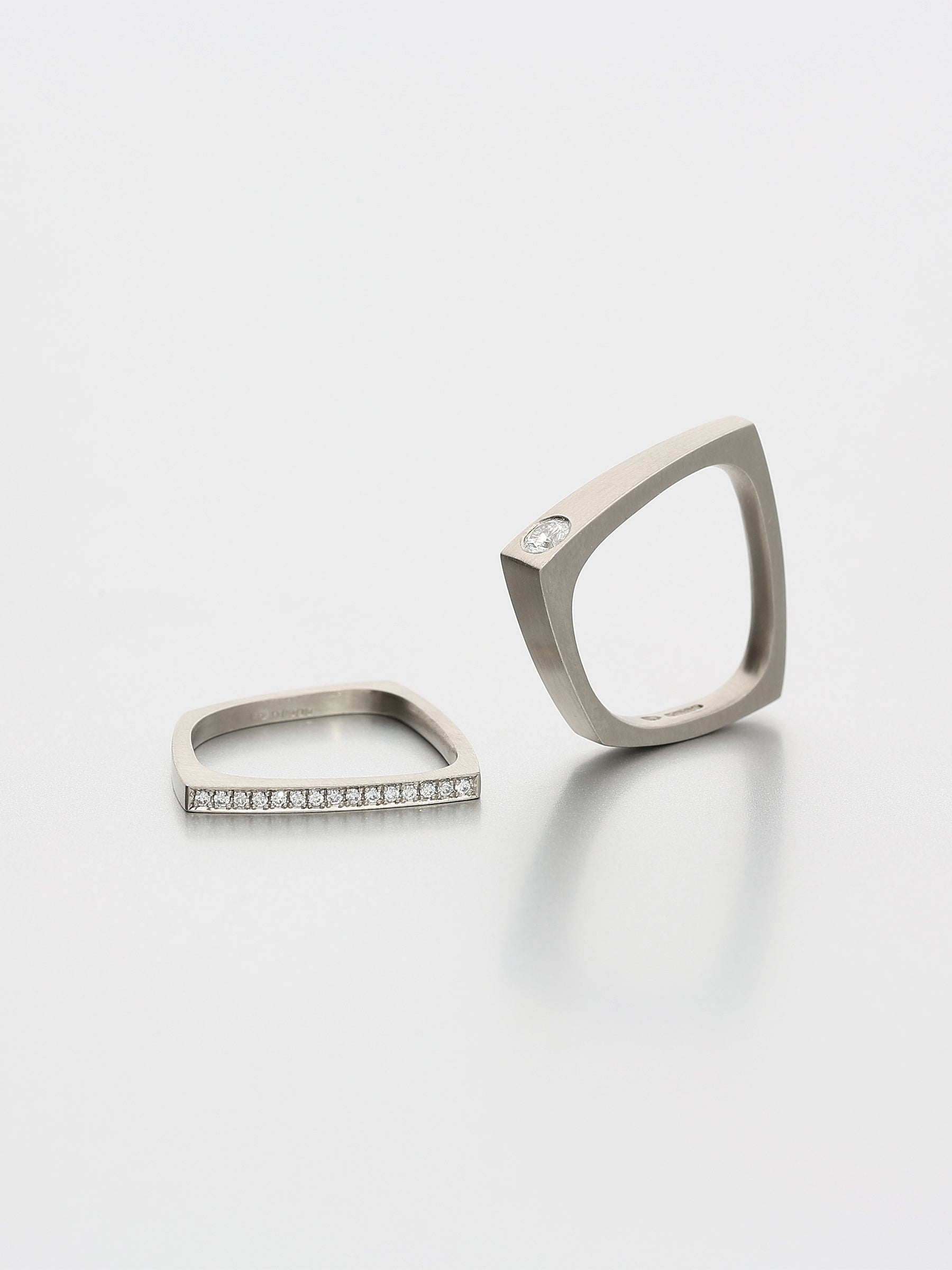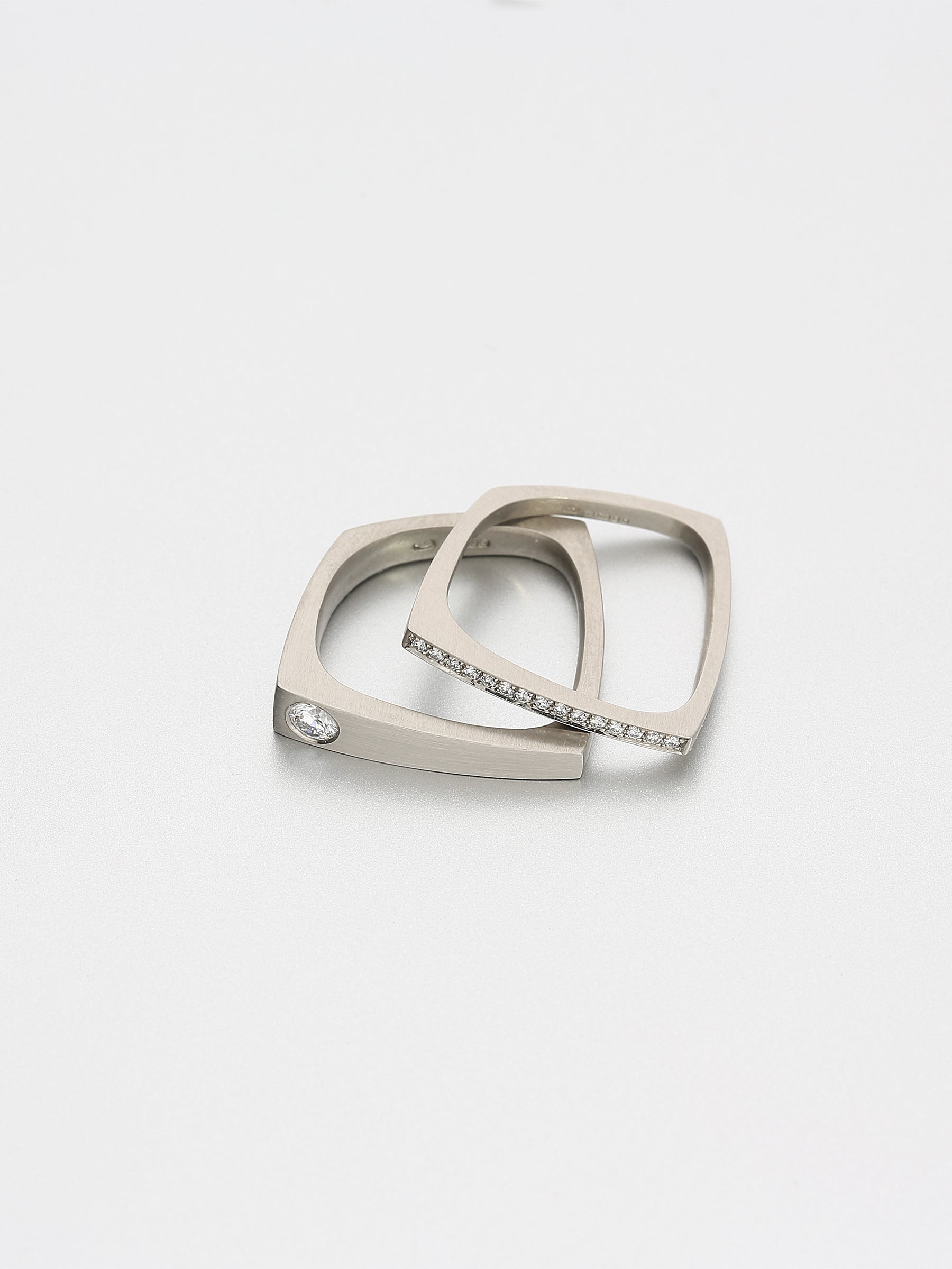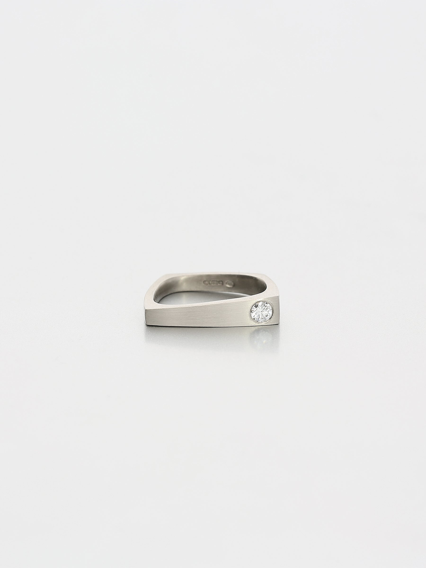 An asymmetric square ring of understated elegance for both men and women. Swept with tapered angles, curves and set with a single, startling diamond to one corner, the Leo VI ring makes a modern statement.