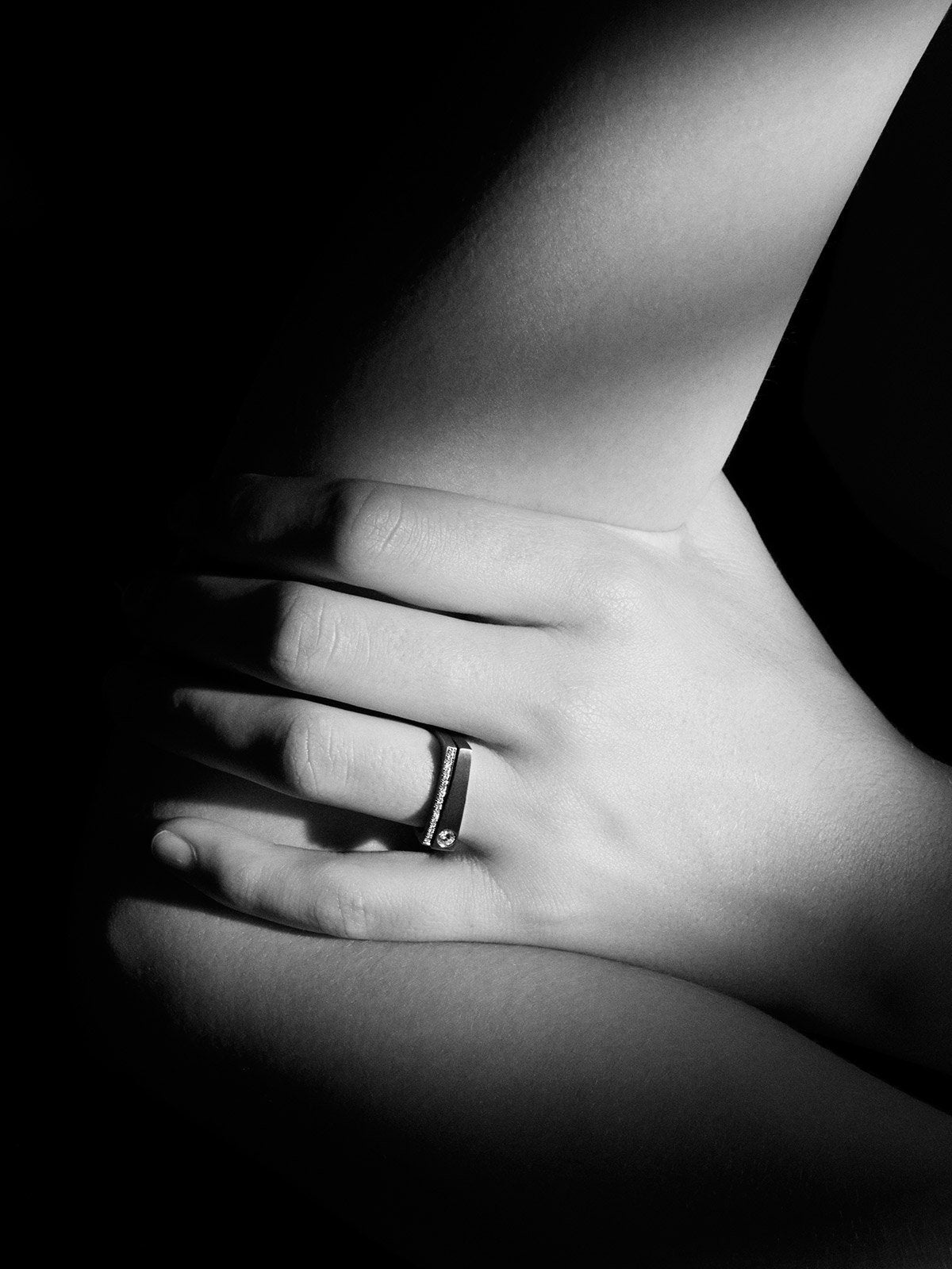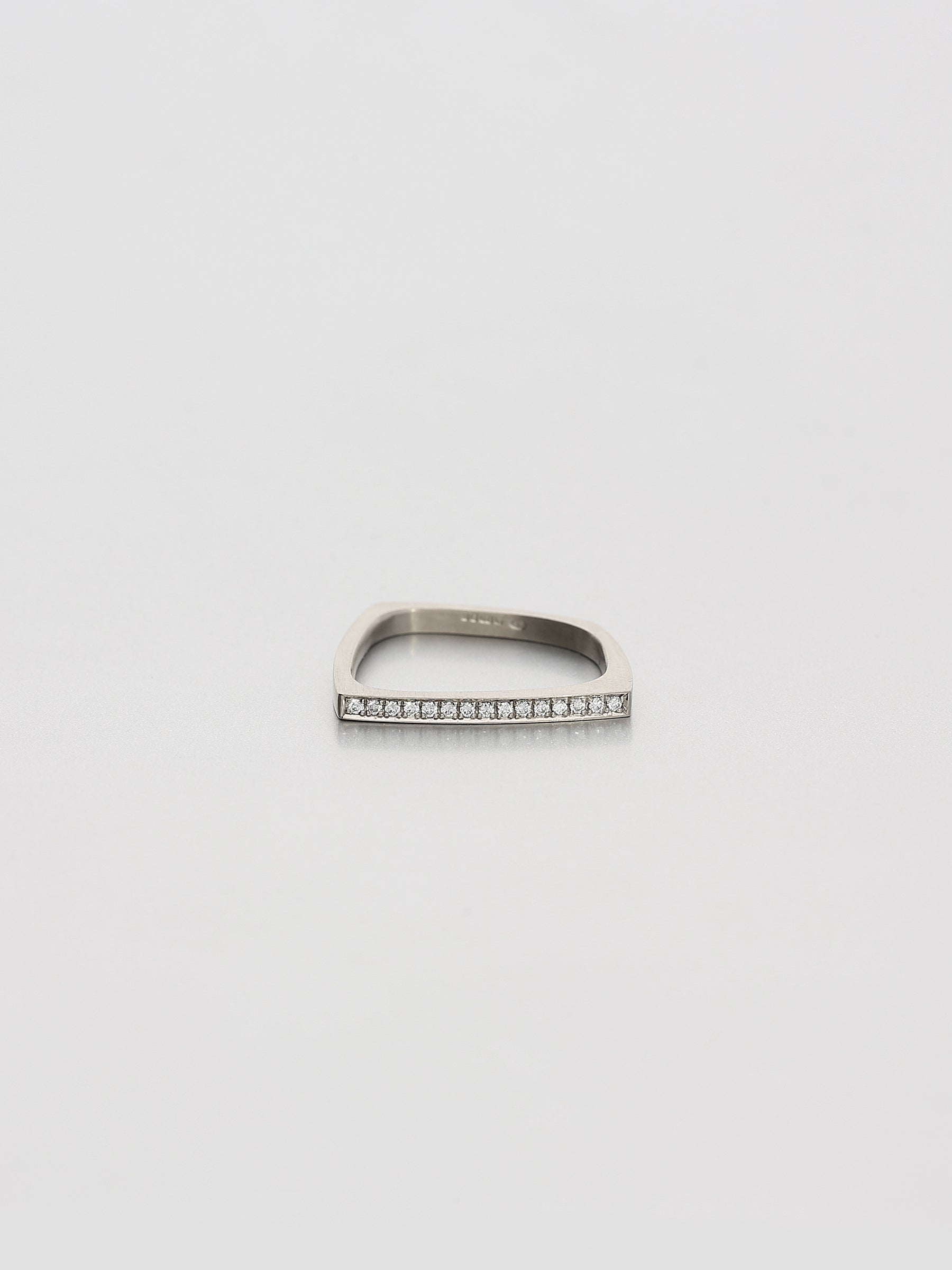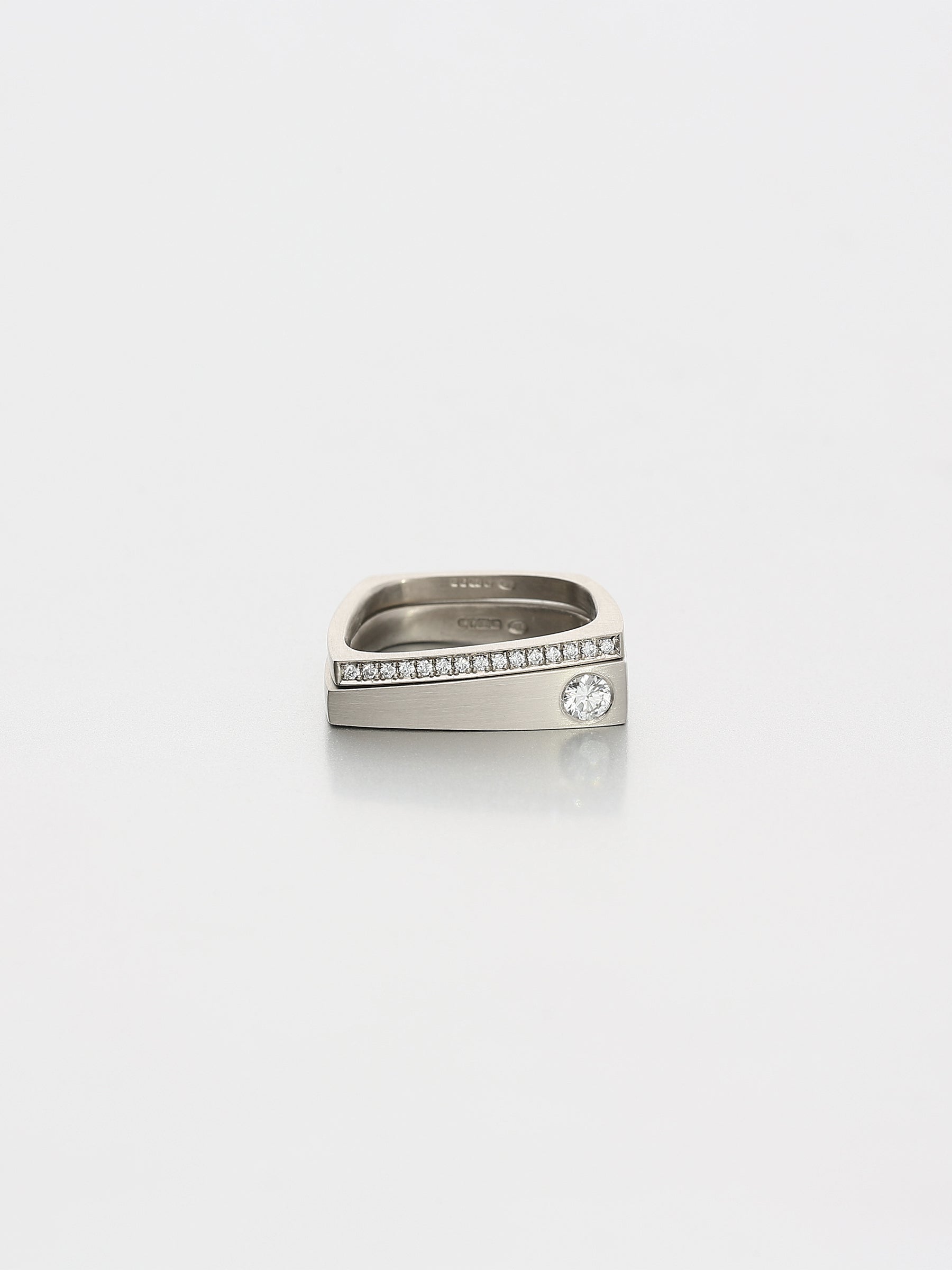 The slim square ring in its asymmetric form is designed to pair with the Leo VI ring. A neat thin sliver modestly crafted in gold or adorned with pave set diamonds on its top edge.